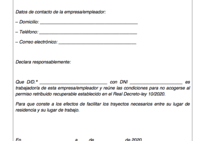 1.- DECLARACIÓN RESPONSABLE A SUSCRIBIR POR LAS EMPRESAS A LOS TRABAJADORES QUE NO SE ACOGEN AL PERMISO RETRIBUIDO RECUPERABLE RECOGIDO EN EL RDL 10/2020 (ACTIVIDADES ESENCIALES) y, por tanto, deban acudir a su puesto de trabajo, siendo necesario que la empresa facilite al trabajador de tal declaración en el sentido que les permita efectuar los correspondientes desplazamientos.